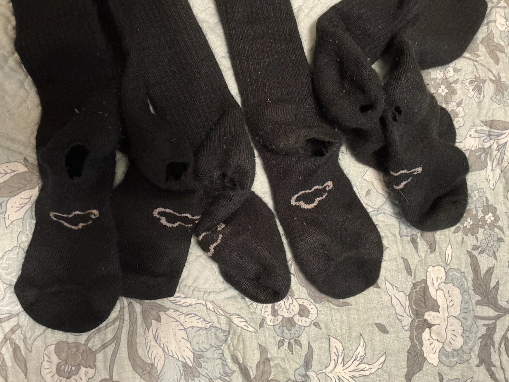 Marybeth qqq I have been buying these socks for years. I bought 8 black pair for winter and they leave black fuzz balls all over the house when I remove my shoes. I also found quite a bit of lint in my dryer and balls of fluff on the inside of the sock. Needless to say, the socks wore out quickly through the heels. I am very sad. These are the only socks I buy and it seems like the yarn or the weave has changed, I will no longer buy these socks.